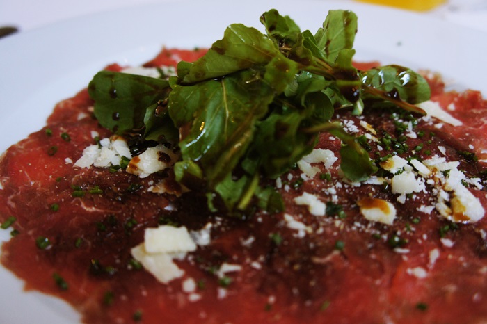 Entre as opções de entradas haviam algumas saladas e sopas frias, mas resolvemos economizar espaço para os pratos quentes e escolhemos apenas um carpaccio.