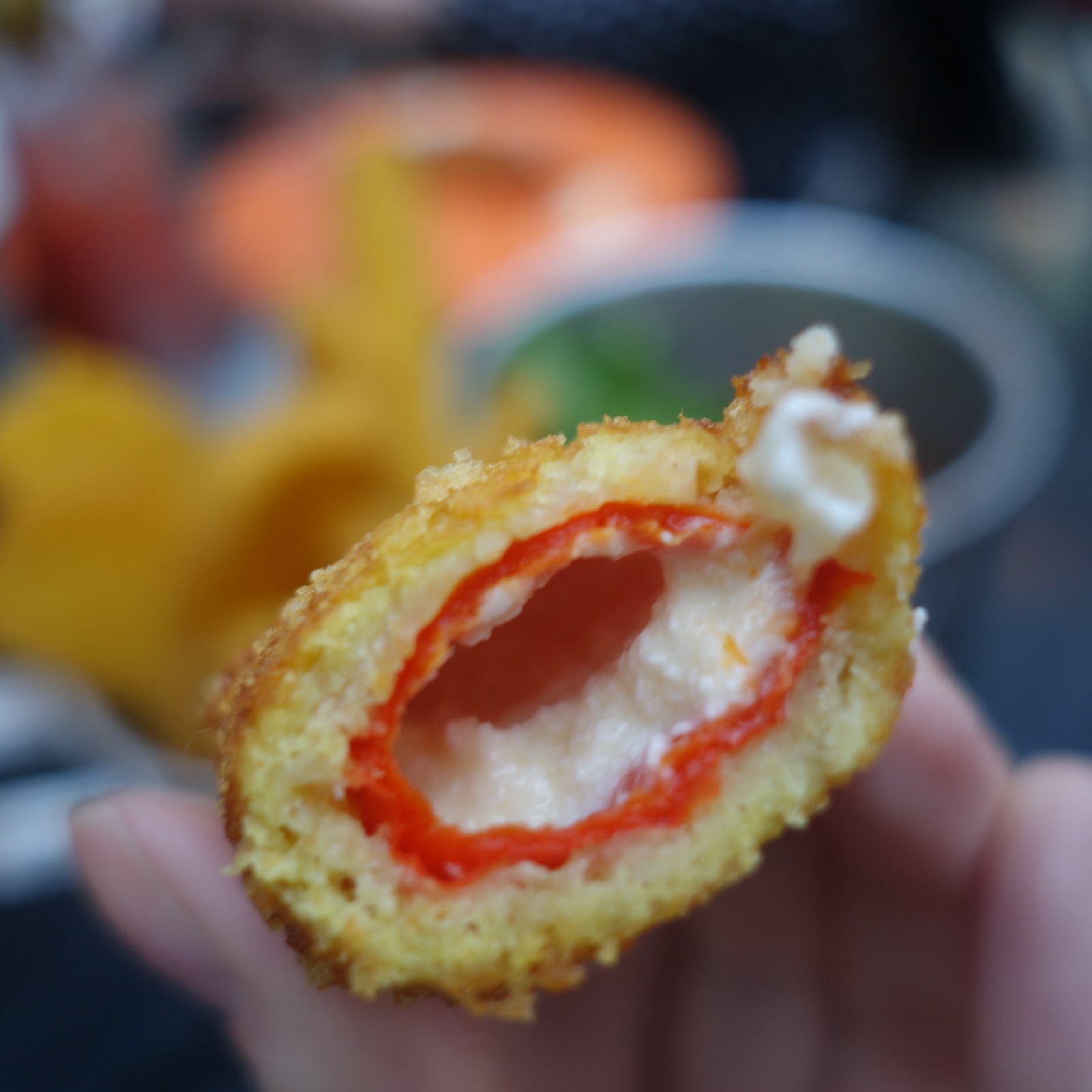 Pedimos também a Dedo de Moça Poppers (R$18), porção de pimentas dedo de moça recheadas com queijo e empanadas. Uma delícia! E quem tem medo de pimenta não se assuste o prato é bem suave, não chega nem a arder!