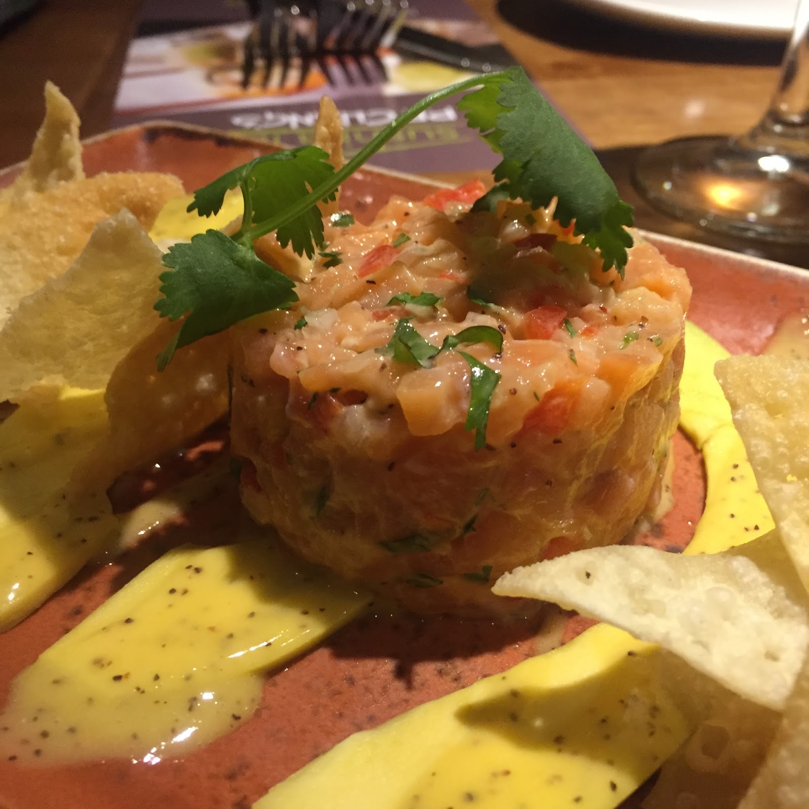 O Salmon Tartare tem tudo para ser um dos mais pedidos, vem com cubos de salmão, pimentão vermelho, cebola, coentro com molho à base de laranja e maracujá servido sobre finas fatias de abacate e acompanhado de massas crocantes de wonton.