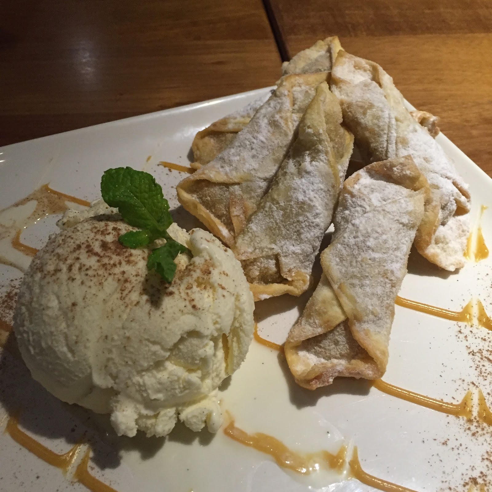 E encerramos com a Apple Crunch, uma torta de maça desconstruída, servida em forma de wrap e acompanhada por sorvete de creme com um toque de canela e doce de leite.