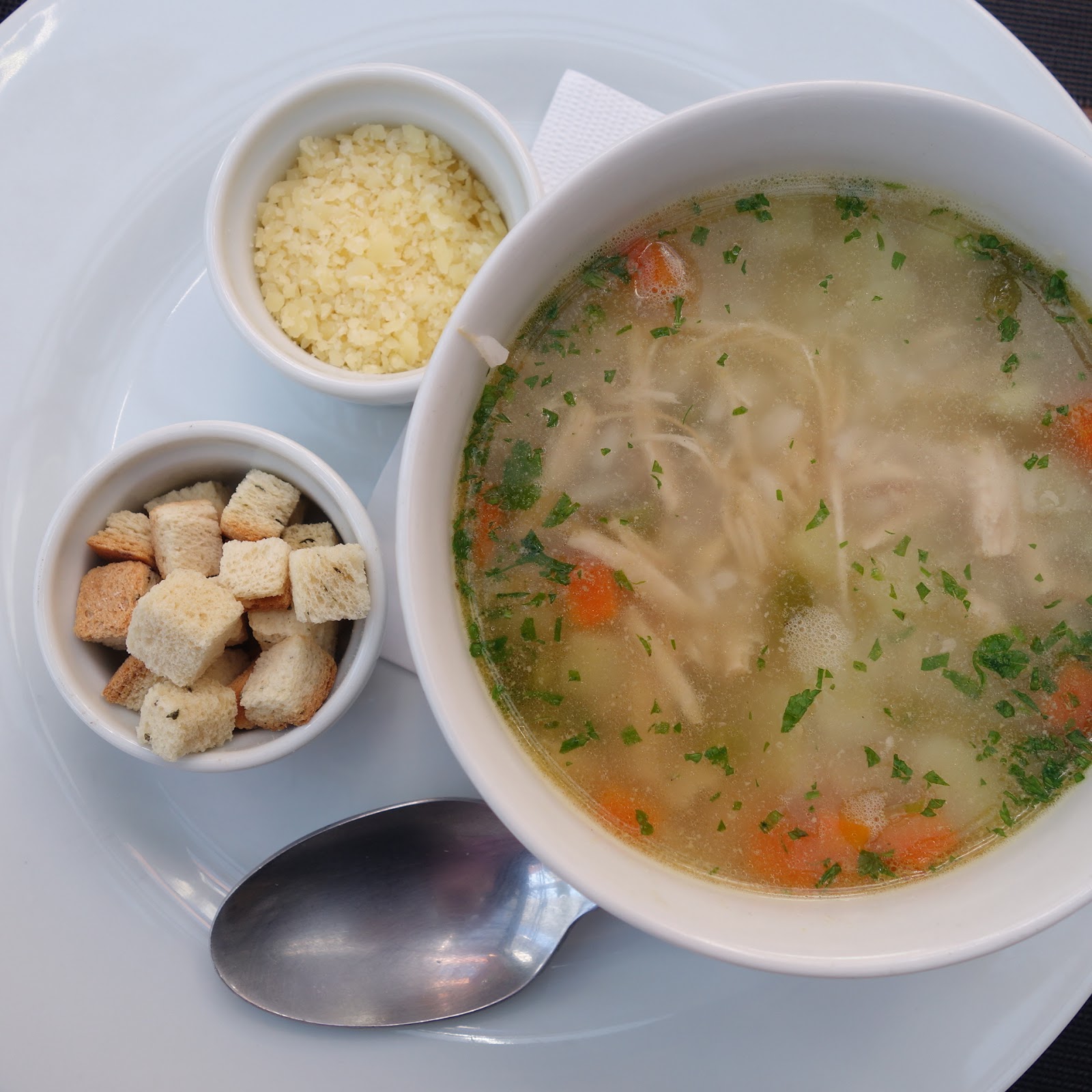 São 6 opções de sopas, o Caldo Verde, a Kippensoep (canja de galinha), a Bonensoep (sopa de feijão), Groenesoep (creme verde de brócolis, couve e espinafre) e o Kaassoep (creme de queijo com manjericão) e a tradicional Erwtensoep (ervilha com linguiça), elas também estão no cardápio a la carte em tamanho normal por R$16. E uma de salada (um mix de folhas, cenoura, tomatinho e queijo maasdam e crouton).