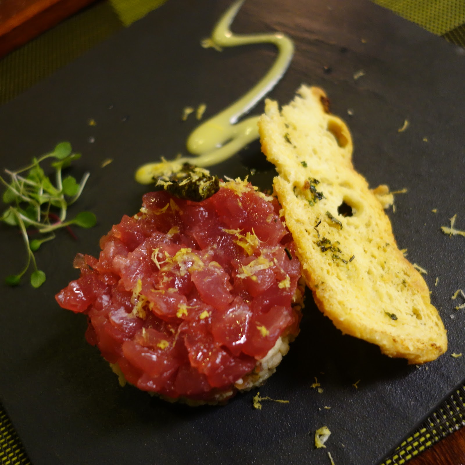 Em seguida partimos para as entradas. São muitas opções apetitosas, principalmente para os amantes de frutos do mar, como eu. Mas ficamos com o refrescante Tartar de atum com couscous, alga nori crocante e limão siciliano (R$35,00).
