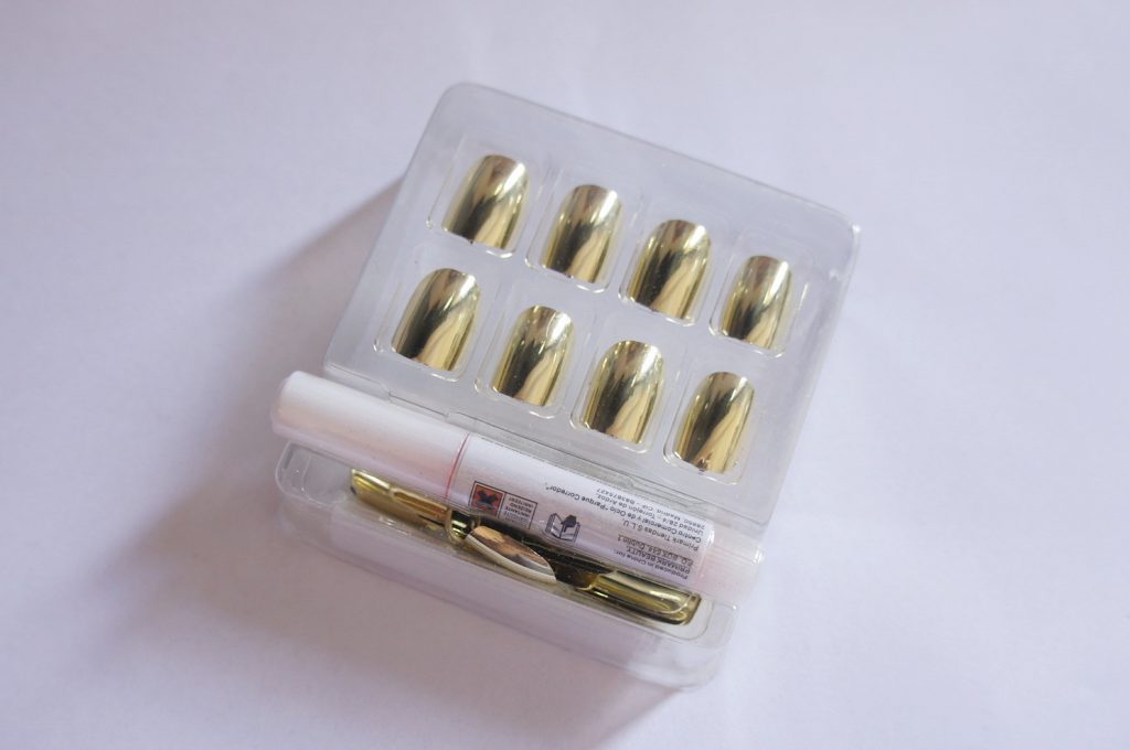 Nunca fui fã de unhas postiças, tentei usar uma vez quando era mais nova mas me incomodou muito e eu acabei detestando aquilo, desde então nunca mais tinha me interessado até que bati o olho nessa na Primark, em Londres. Sempre sonhei com unhas douradas de verdade e já tentei vários esmaltes e adesivos, mas o resultado nunca foi satisfatório, então, quando vi essas douradas como eu queria e curtinhas do jeito que eu gosto por míseros 1 pound (uma cartela normal de unhas postiças por lá custa em média 7 pounds), levei logo 4 para testar.