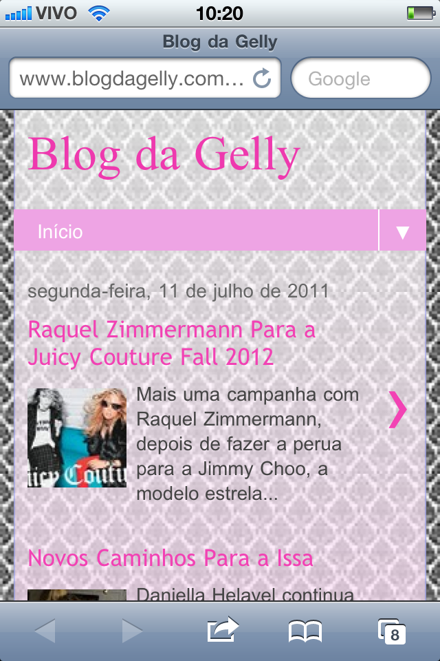 Agora você pode acessar o Blog de onde quiser com bem mais facilidade e sem perder nada. Ao entrar no BlogdaGelly.com pelo seu smartphone, automaticamente a página mobile vai abrir, o conteúdo é o mesmo, apenas a diagramação e o tamanho das imagens é que são diferentes. Mais praticidade e economia para as minhas leitoras que não vão precisar baixar aquelas imagens enormes. Claro que quem preferir ver o layout normal não vai ficar na mão, é só clicar lá embaixo em “Acessar versão Web” que você volta a acessar a página normal.