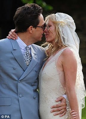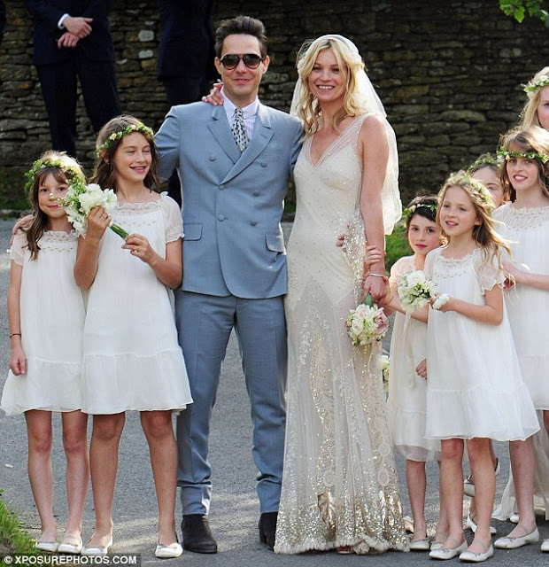 E a party girl mais famosas dos últimos tempos já é oficialmente uma moça casada, será que agora ela vai sossegar?? As primeiras fotos depois da cerimônia religiosa mostram Kate, o noivo Jamie Hince e várias daminhas de honra, entre elas a filha de Kate, Lila Rose. O vestido de seda off white com transparências e aplicações de cristais foi mesmo desenhado por Galliano, o estilo é meio vintage, como Kate adora. O sapato, ao contrário do que eu contei antes, foi mesmo um Manolo Blahnik, que ganhou sola azul para ser o item azul que pela tradição da sorte a noiva! E ai, o que vocês acharam??