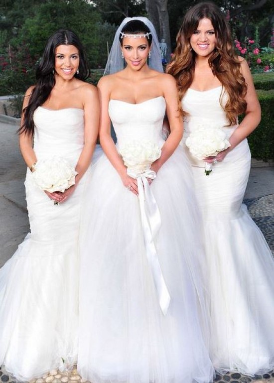 Kim escolheu suas irmãs, Kyle, Kendall, Kourtney e Khloe, e a irmã de Kris como madrinhas. Todas usaram o mesmo vestido Vera Wang branco com cauda sereia (meus preferidos!) e um bouquet de rosas brancas, iguais ao da noiva, e por mais que, para nós brasileiras, possa parecer estranho elas terem usado a mesma cor de vestido que a noiva, se trata de outra superstição, em alguns países acredita-se que os vestidos claros das madrinhas trazem boa sorte a noiva.