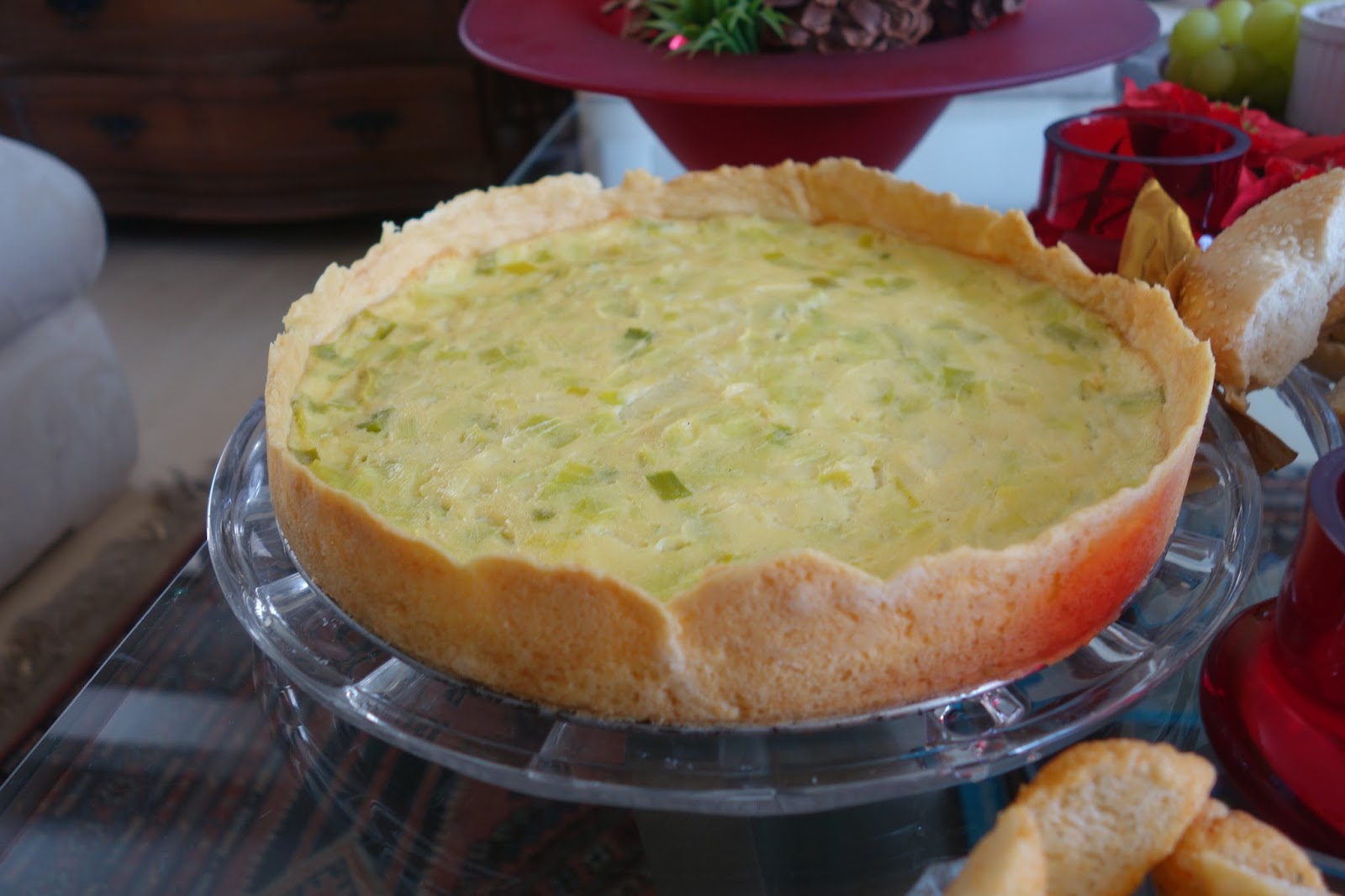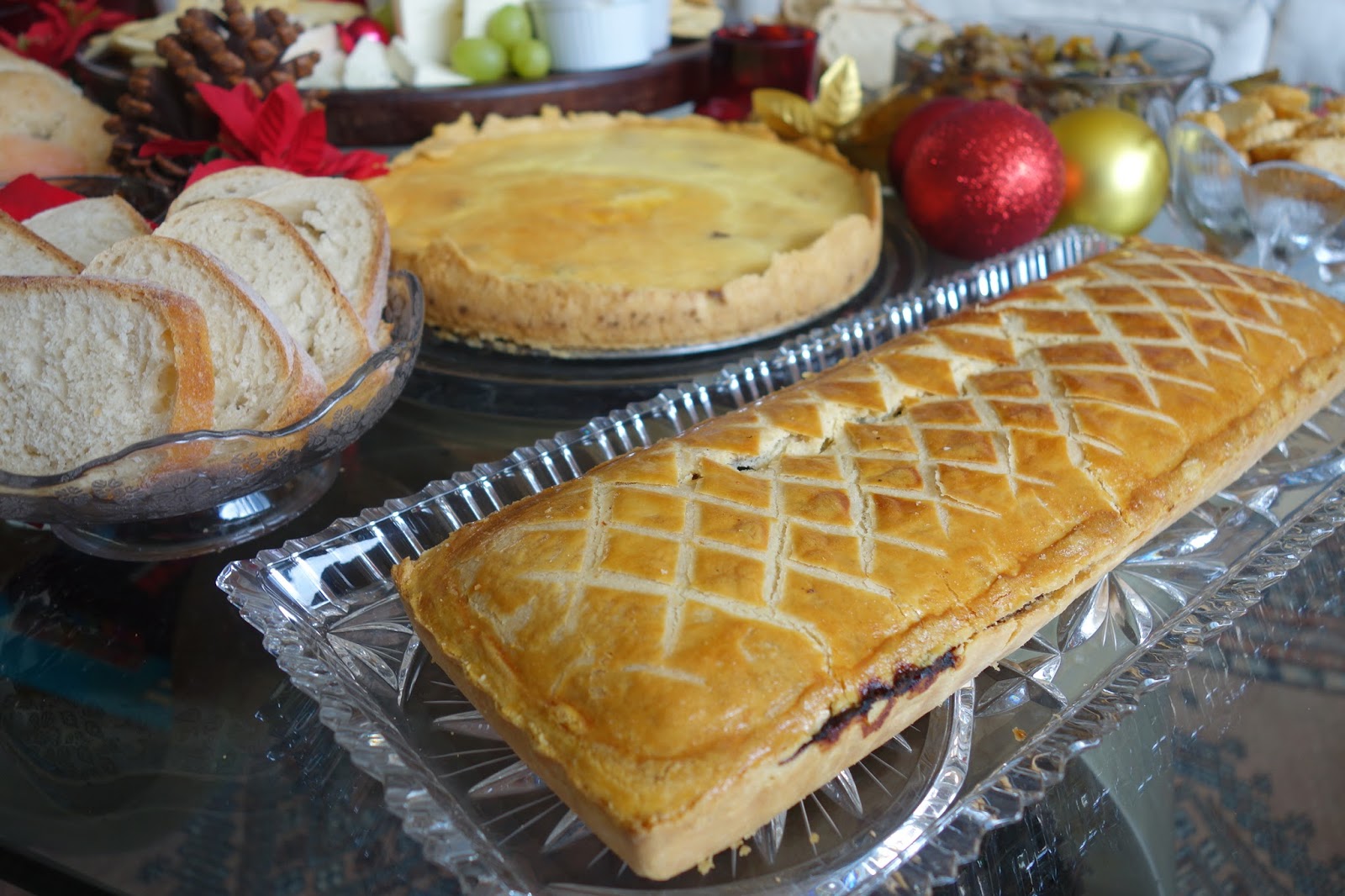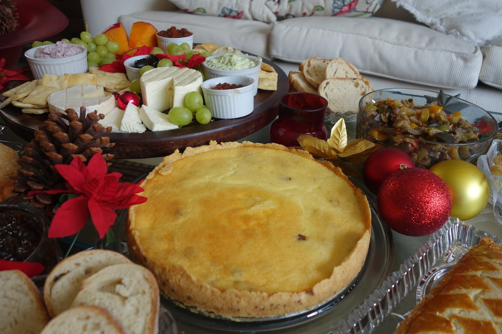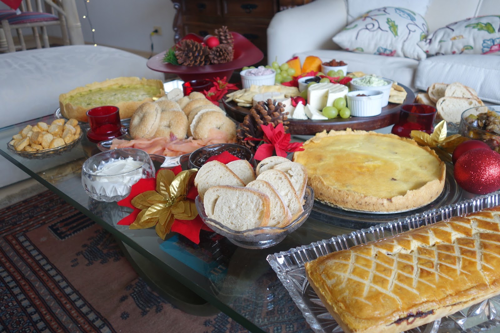 Arrumamos a mesa principal na sala de estar, afinal é onde ficamos a maior parte do tempo e assim poderíamos ficar conversando e comendo. Colocamos tudo que era pra beliscar: a tábua de queijos, dois quiches (um lorraine e um de alho-poró), torta de carne da Torteria, bagels, salmão defumado, cream chesse e cebola caramelizara maravilhosa da Queensberry, caponata de berinjela e alguns pães.