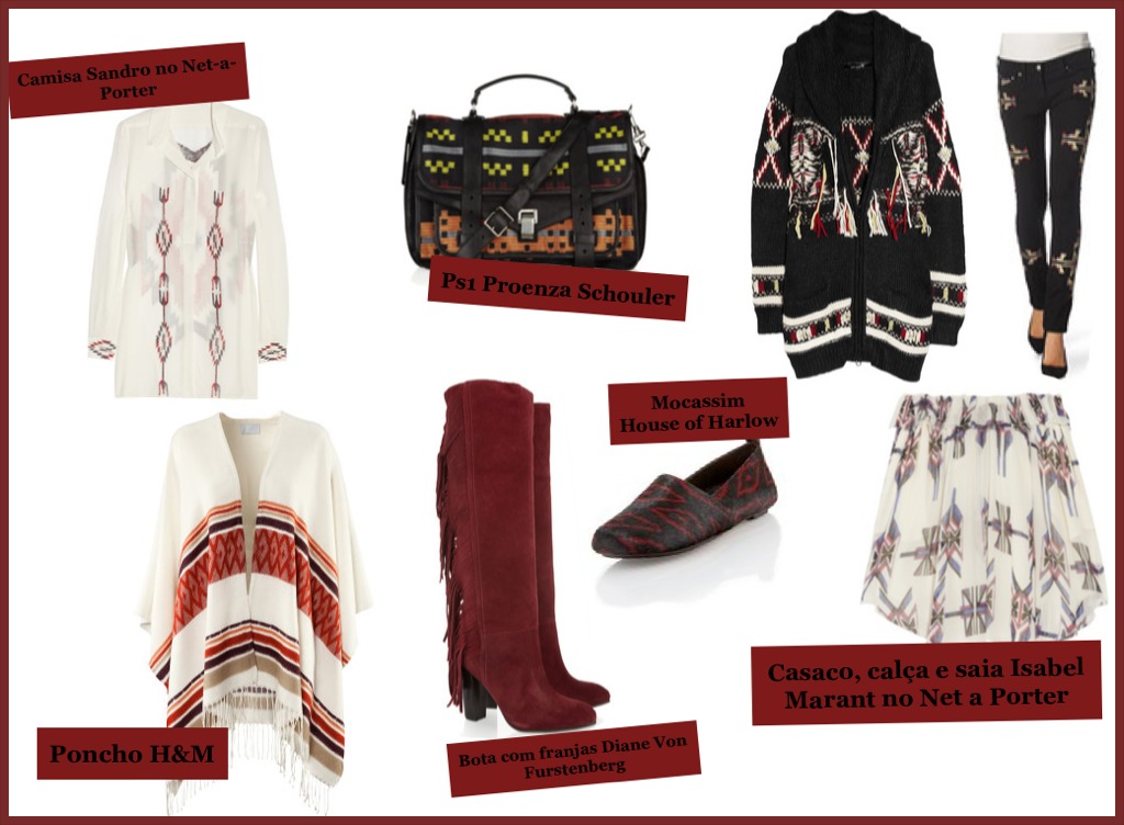 Não fiquei surpresa ao descobrir que as peças eram de Isabel Marant, afinal, a estilista francesa vem criando um hit atrás do outro e já caiu no gosto de it girls e celebridades mundo a fora, toda estação ela emplaca mais uma peça desejo, lembra das varsety jackets do verão passado? Já a estampa Navajo é caracterizada pelas formas geométricas usadas no artesanato da tribo indígena norteamericana de mesmo nome, ao lado da estampa africana é um dos clássicos do estilo tribal e fica ótima combinada com peças com um estilo mais boêmio. Agora, se você gostou e não tem milhares de dólares para gastar, não foi só na Isabel Marant que a estampa apareceu, aqui embaixo você confere um mini guia de compras, que tem de Proenza Schouler, que também fez uma coleção de inverno recheada de referencias navajo, com direito a it bag Ps1 estampada, até as redes de fast fashion, como esse Poncho da H&M.