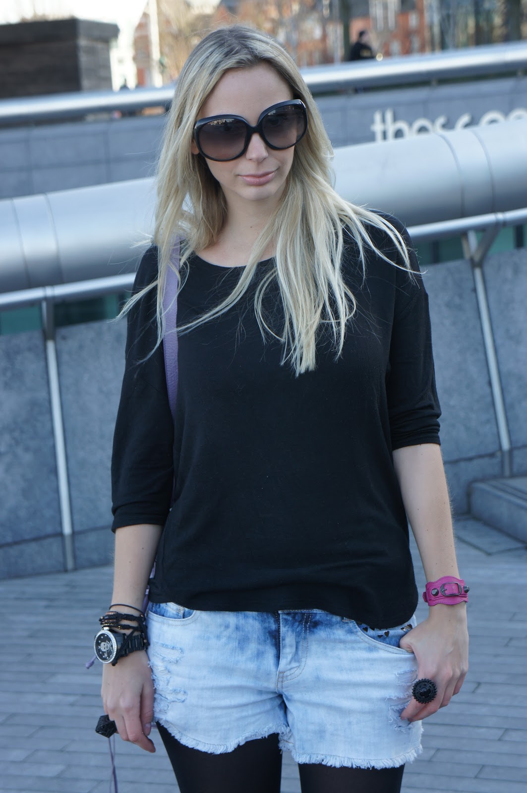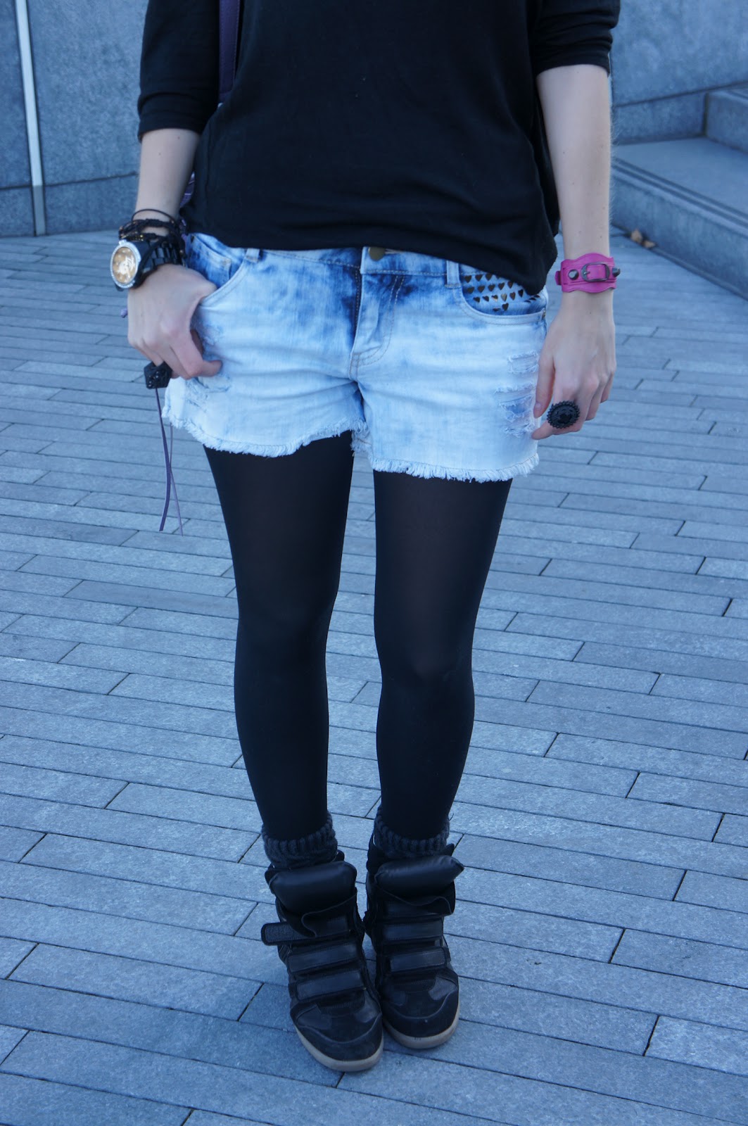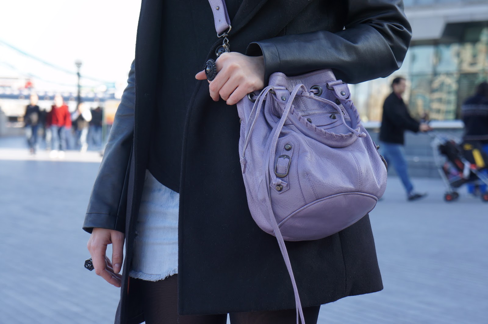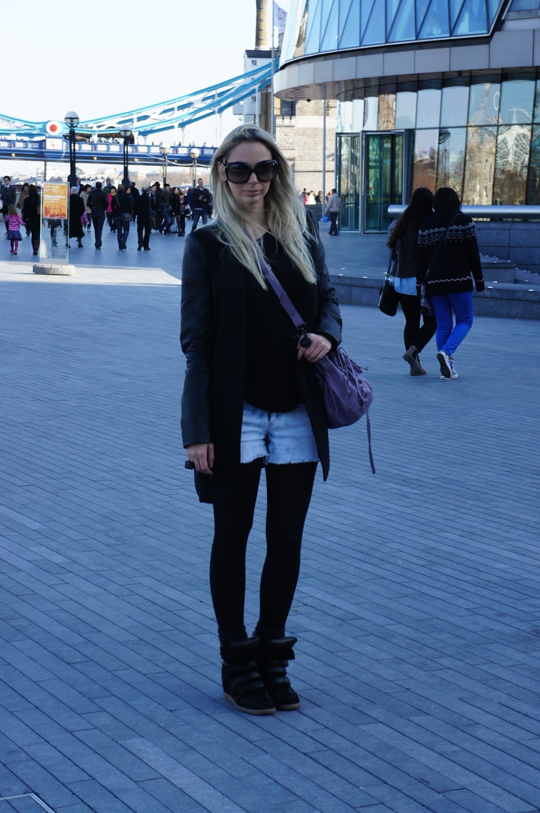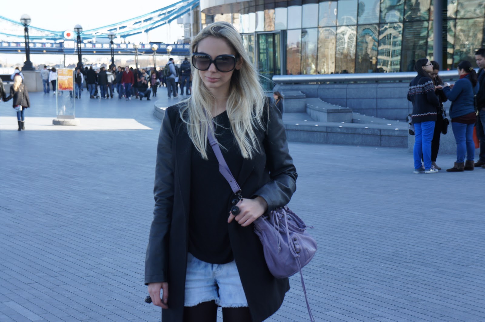 Finalmente, depois de umas longas férias, estou de volta! E é claro que cheia de novidades, dicas e looks do dia! Para começar, vou mostrar mais um look fotografado em Londres para vocês, bem básico e confortável, afinal já estava no fim da viagem, por consequência da mala também e o cansaço já tomava conta de mim. Como o frio estava dando uma trégua deu para deixar as mil leggings térmicas de lado e usar apenas uma meia calça com o shorts jeans boyfriend da Forever 21. A blusa escolhida foi uma malha preta bem fininha e gostosa da Topshop e para finalizar o casaco com mangas de couro da Stradivarius e o sneaker Isabel Marant, que vocês já não devem mais aguentar ver, e a bolsa Mini Pompom da Balenciaga.