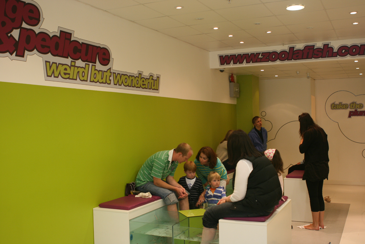 Estava andando pelos mercados de Candem Town, quando me deparei com uma aglomeração de gente na frente de uma loja, curiosa como sou, me enfiei no meio do pessoal para ver o que era e então fiquei mais curiosa ainda, era um serviço de pedicure realizado por peixinhos, tive que experimentar!!