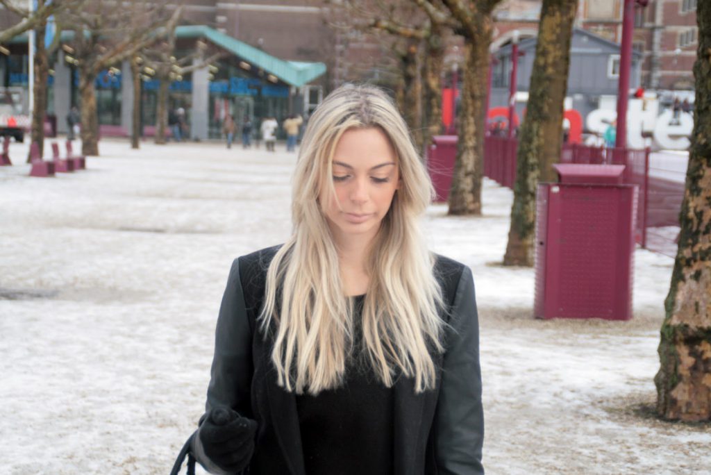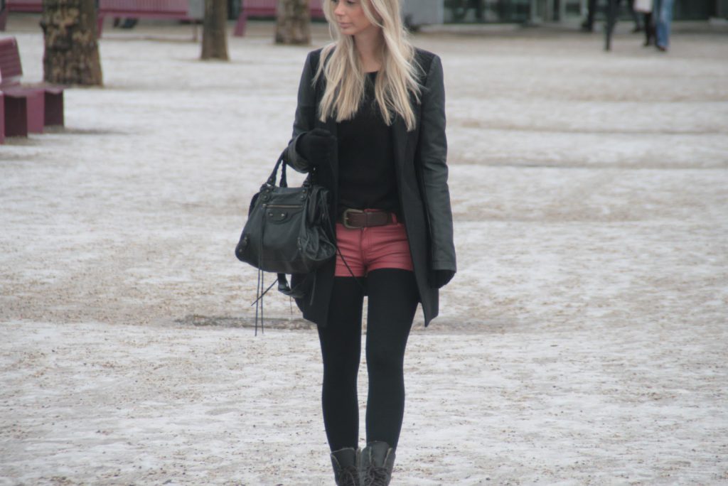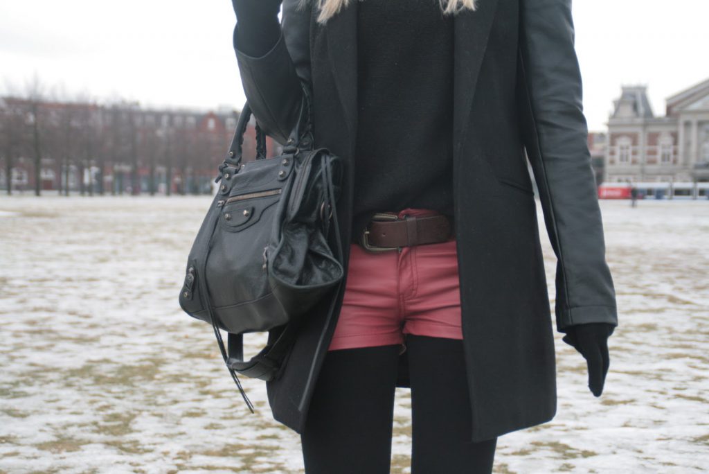 Na falta de looks novos para postar (ando meio preguiçosa pra tirar fotos!), estava vendo minhas fotos antigas e achei algumas da minha última viagem que eu ainda não mostrei para vocês. Apesar da neve, a temperatura em Amsterdam nesse dia não estava tão fria, fazia por volta de 6 graus, então considero esse look super usável nesse mini inverno que tem feito aqui em São Paulo – isso é tirando algumas camadas de roupa que eu estava usando por baixo e que vocês não estão vendo! O shorts de couro vermelho da H&M vocês já tinham visto numa versão verão nesse look aqui, mas como o couro originalmente é um tecido mais usado em baixas temperaturas, acho que ele também fica ótimo usado com meia-calça e com peças mais pesadas. Nesse caso combinei com uma malha preta básica e com o sobretudo com manga de couro da Stradivarius, o resultado foi um look bem básico mas um pouco diferente do preto total que tanto vemos durante o inverno europeu! E aí, o que vocês acharam??