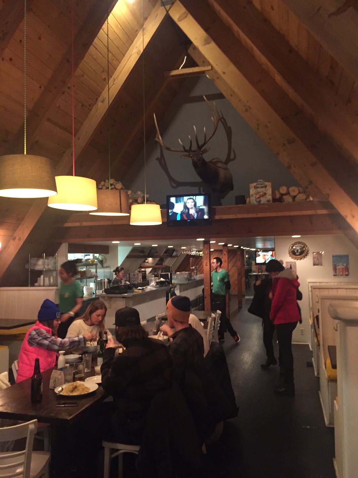 Fomos no Yodler logo que chegamos, ele fica bem no pé da Mammoth Mountain e bomba no fim do dia no aprés-ski. A casa tem clima alpino e um cardápio com uma leve inspiração alemã, mas como todo restaurante americano também tem hambúrguer, sanduíches e flatbreads. São poucas, mas boas opções, há algumas entradas e petiscos para compartilhar em clima de happy hour, uma delas é o fondue de queijo que caiu como uma luva para nos esquentar depois dos -6° que fazia lá fora.