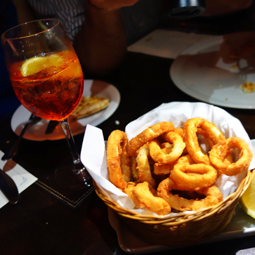 Começamos provando as deliciosas I Calamari, lulas empanadas bem crocantes acompanhadas por molho marinara e limão siciliano.
